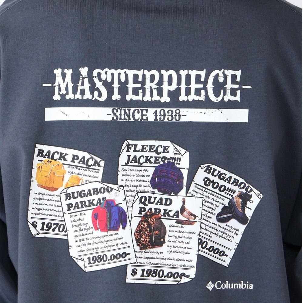 背面には、コロンビアのマスターピースを古新聞風にプリントしたヒストリカルなグラフィックを配置。どこかレトロで遊び心のあるデザインが魅力です。トレンド感のあるリラックスフィットシルエットで、幅広いボトムスと好相性。ユニセックスで着られるため、XSサイズを活かした親子リンクコーデにもおすすめです。